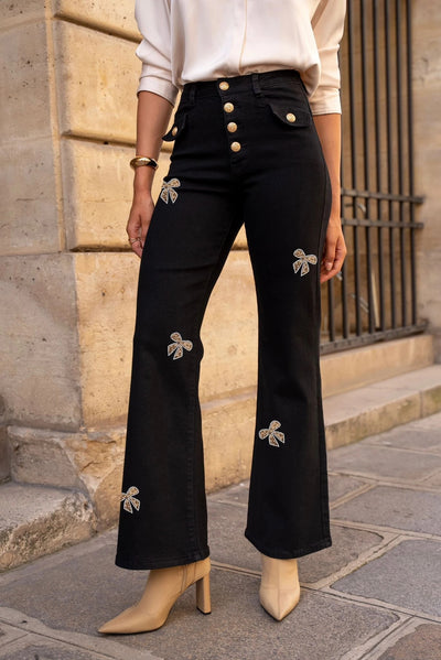 Black Stretch Wide Flare Jeans with Button & Bow Front
