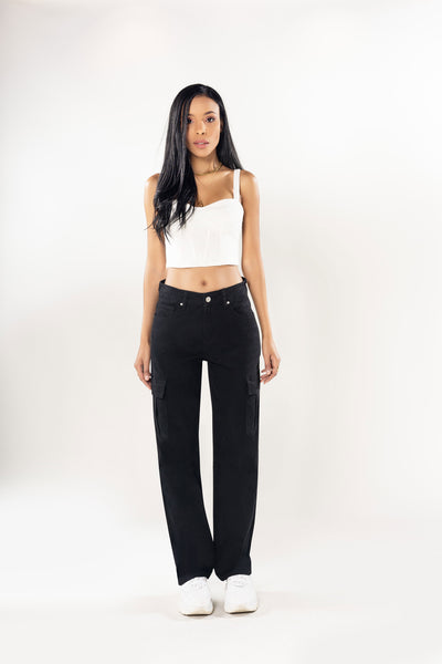NoirFlex High-Waist Plus Size Bootcut Cargo Jeans – Black